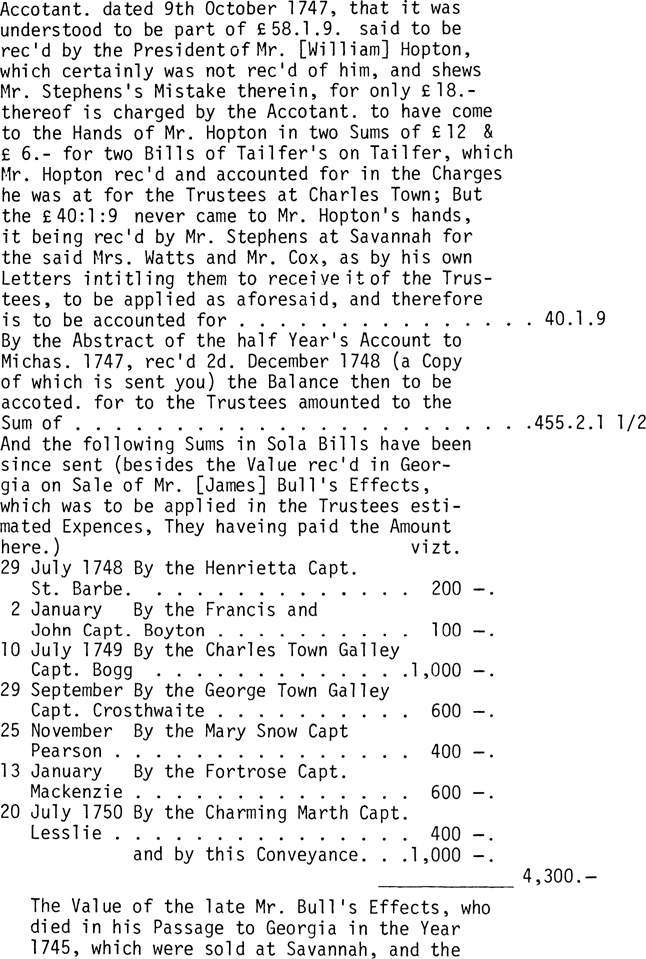 And that since the Non Payment in Georgia of the above mentioned £18:10:- as balance of the said Account drawn for by her on Mr. [William] Stephens 30th. May 1747, She rec’d the £7.10. for her like Salary therein Charged from 25th Septr. 1745 to Lady Day 1747, at two Payments, the One on the 31st. of August 1747 of £ 5.- to 25th. Septr. 1746, and the Other the 10th. of December foll. of £2.10.- to Lady Day 1747.