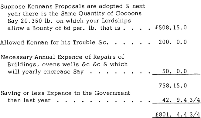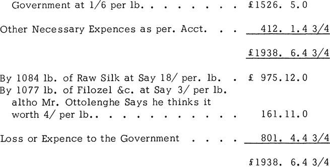 I have the Honor to acquaint your Lordships that the Silk Produced this year amounting to 712 lb. 8 oz. is ship’t on Board the Vessel by which I Send this letter. The Accounts & Vouchers attending the whole matter were yesterday Examined in Council approved & Passed for £ 1619. 12. 0 1/2 and as Soon as this Vessel Sails I Shall give the Persons who advanced their Money, Certificates for the Several Sumes they paid in to the Commissary. I have been very explicit on the Subject of the Silk Culture in Several of my Letters Since April last, and am daily Expecting your Lordships answer and directions on that Head, on which I have nothing to add, but beg leave to refer to the letters I have already wrote.