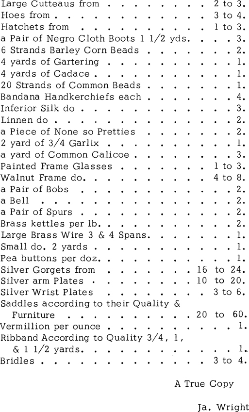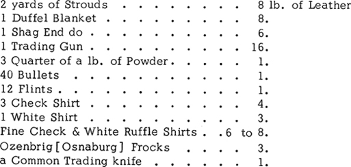 Prices of goods in the Indian trade under Georgia licences, [Savannah], received Nov. 10,1765, read June 27, 1766, C.O. 5/649, F. 56. In Wright to Board of Trade, Aug. 19,1765.