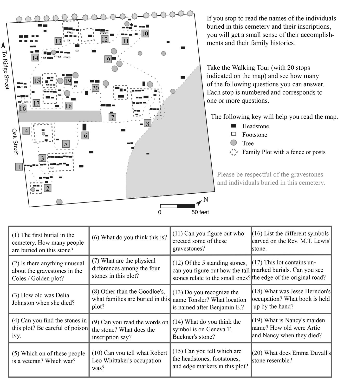 Older students can calculate the average death date, determine the percentage of males and females or adults versus children, learn spatial skills by mapping the gravestones, or apply Visual Thinking Strategies (VTS) by closely examining the stones. College students can embark on more detailed studies of the socioeconomic backgrounds of the deceased and oral histories with surviving family members and reconstruct a social history of the community. Teachers can compile this research into a tour that guides students through different chapters in local history.