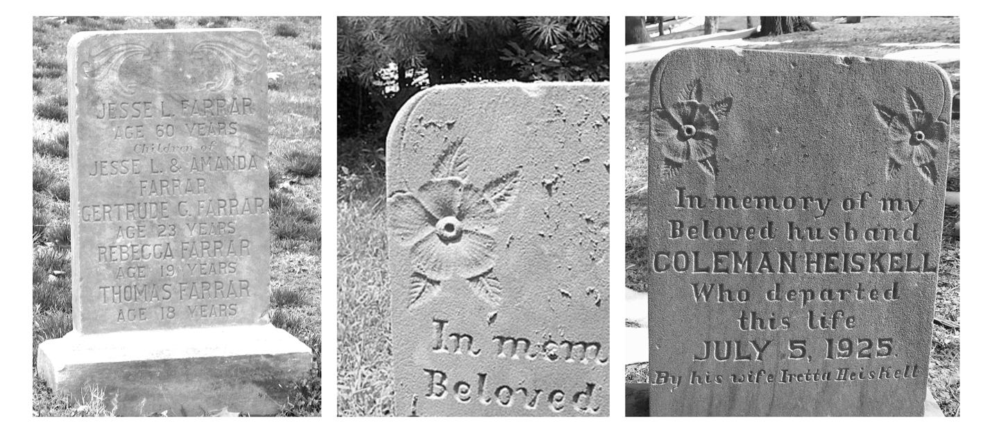 Figure 3.4. A selection of gravestones from the Daughters of Zion Cemetery that illustrate patterns in genealogical data, motifs, and inscriptions (photograph by the author)