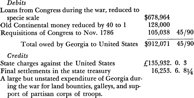 The 1787 assembly complained that neither of the federal commissioners for settling accounts had done anything toward the duties of his office, despite the fact that the state auditor had long had his books and charges against the United States ready for examination.17 When the final settlement of state accounts with the United States was made in 1793, a balance of $19,988 was found due to Georgia by the United States.18
