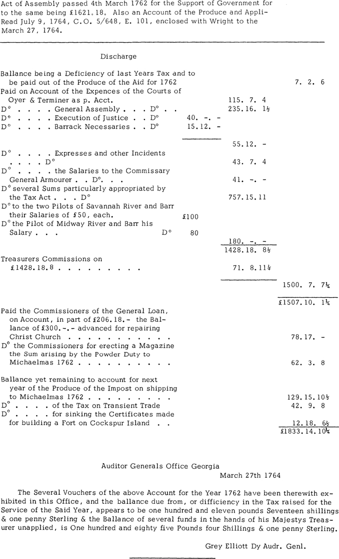 I have lately done my Self the Honor of Writing to your Lordships Several times, and now Transmit to your Lordships an Act to Prevent as much as may be the Spreading of the Small Pox in this Province Passed the 7th of December 1764. Also Copys of the several other Bills assented to by me on the 25 of March last, having already Sent to your Lordships The Bill for the better Strengthening & Settling of this Province &c and the Ordinance appointing Mr. Knox Agent from May 1765 to May 1766. The Rest of the Bills are as follow Vizt. An Act for Granting to His Majesty the Sume of £1599.7. 1 1/2 Sterl. for the use & Support of the Government of Georgia for the year 1765 to be Raised at Certain Rates & after the Method therein Mentioned & for the more Effectual Collecting of Arrears.