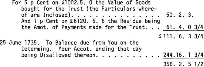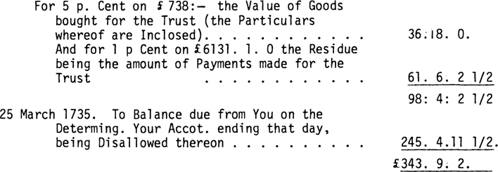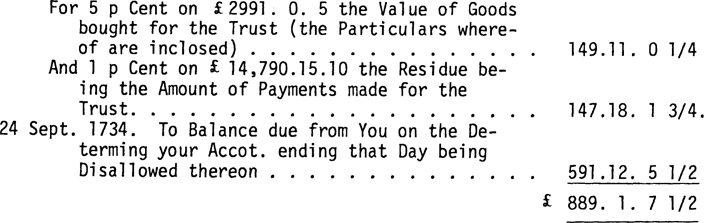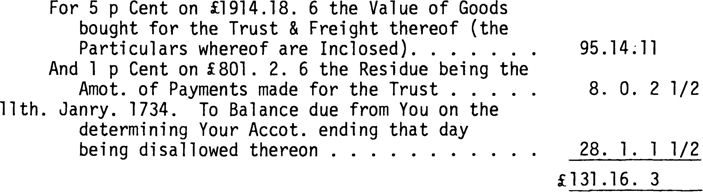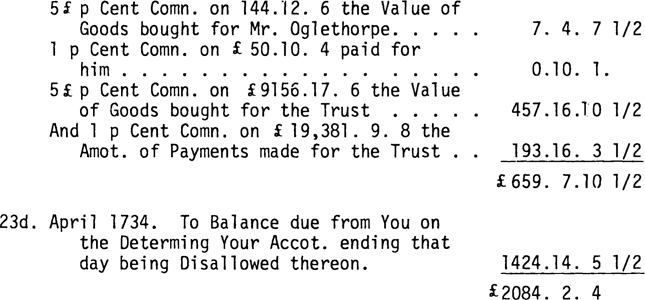The Charge in Your first Accot. ending the 23d. of April 1734 is Entered £30,817.16. 21/2 Currency which should be only £30,817.12.4 and Your Discharge thereto (without Commission) is Entered £29,350. 6. 2 1/2 which by wrong Entrys Miscastings and a Disallowance of £ 617.10. 0 for the Reason assigned in the Accot. Current inclosed reduces it to £ 25,733.10. 0. The Balance then is £2084. 2. 4 whereout the Discharge consisting of £ 144.12. 6 the Value of Goods bought for the separate Accot. of James Oglethorpe Esqr. £ 50.10. 4 Money paid for him £9,156.17. 6 the Value of Goods bought for the Trust (the Particulars of which 3 Articles are Inclosed) and £19,381. 9. 8 the Residue being the Amount of Paymts. made for the Trust. The following allowances are made You for Commission towards Discharge of the said Balance.