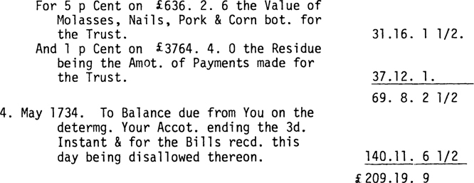 The Charge in Your next Accot. ending the 3d. of May 1734 amounts to £2800, and Your Discharge in the said Accot. (without Commission) amounts to £ 4400. 6. 6. The Balance then due to You thereupon was £ 1600. 6. 6 But You reed, the next day Bills of Exchange on London for 300 £ Sterling which is £2100 Currency at 7 for 1 and paid thereout by way of Change to John Brownfield the 6th. of the said month £289.13. 9 which added to the above Balance makes £ 1,890. 0. 3 and then the Balance on the said £ 2100 (without Commission) amounts to £209.19. 9 towards the Discharge whereof the following allowances are made You for Commission. Vizt.