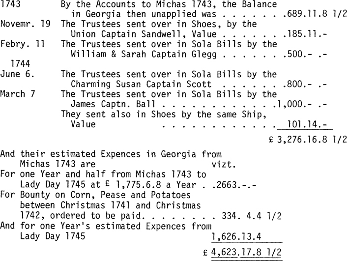 The Trustees hope you have received the seasonable Supply of £1,000. in their Sola Bills sent you by the James Captn. Samuel Ball the 7th. of March last; When in their Letter, the Receipt of your Letter, Journal and Papers, sent in October before, was acknowledged. And on 16th. of said March by the same Ship, you was also acquainted that your Vouchers from 1st. December 1741 to Michaelmas 1742 had been examined, and found to agree with your Accounts within that time. And the Trustees now acquaint you, that the Vouchers for the Year ending at Michaelmas 1742 have been also examined, & found to agree with the Accounts for that Year. And you having been instructed to proceed in sending the like examined Copies of Vouchers, or Duplicates from Michaelmas 1743 to the 1st. of March following; The Accounts (when they arrive have been examined, and found agree, within that time) will then be fully authenticated to the time of the present Method taking Place which they are in, and is very satisfactory.