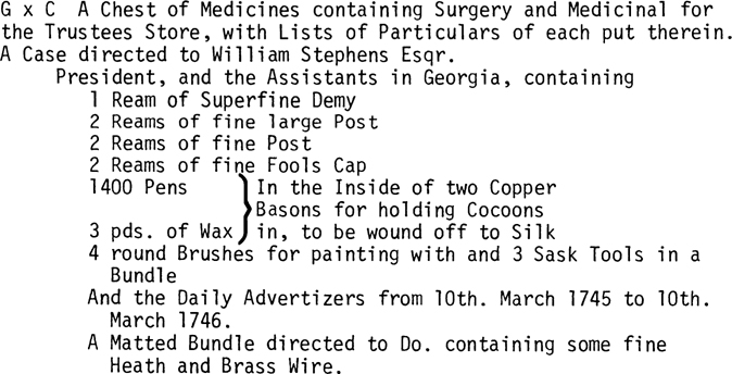 | EBENEZER. | 1 Case from Amsterdam. And for William Stephens Esqr. for the Use of the Colony. A Machine for winding Silk and a small Copper for the Silk Balls. A Basket of Wrought Iron. And a Box with Books, Papers and Letters |