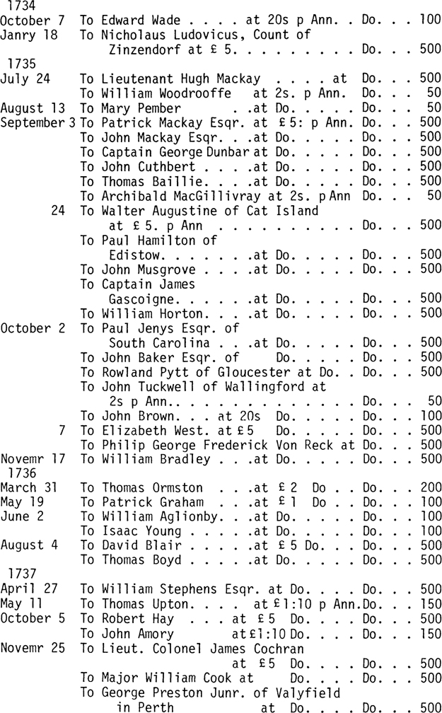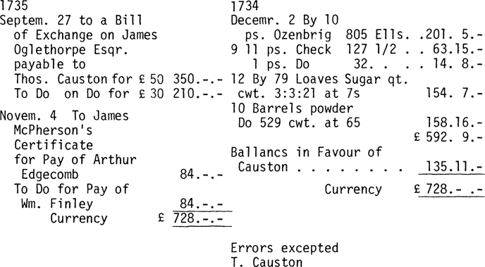 As to the £592.9.- it still appears a Transaction on Mr. Causton’s private Account, and herewith you receive his State of it, and how discharged, with a Surplus due to him of £135.11.-Currency on that Account. But it also appears, that the said Mr. Causton drew on your late Brother the two following Bills, for which no Credit was taken in your said Brother’s Account with the Trustees, vizt. A Bill dated 27th. September 1735 to Andrew Grant for £ 300. Currency, and a Bill dated 5th. November foll. to Samuel Lacey for £ 260 Currency, making together £ 560. Currency, whereout the said Overpayment of £135.11.- on Mr. Causton’s private Account being deducted, which Mr. Causton claims of the Trustees in Account with them, the Balance in Favour of your late Brother’s Estate, on these States against each other, appears to be £ 424.9.- Currency, which in Sterling at £ 700 P Cent, the then Exchange, amount to £60.12.8.