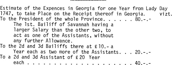 With the £ 1,000. Sola Bills sent you as abovementioned was an Estimate, for one Year’s Expence in the Colony from Lady Day last, which amounted to £ 1,626.13.4, wherein any Saving that could be made, you were told would be acceptable; And the more so, for that the Trustees have made no Application to Parliament for these two Years past, on Account of the Exigencies of the Government in the present War. But the Trustees intend to make an Application in the next Session for a further Supply, which as probably will be but small, and will only be applied for the Support of the Civil Government; The Trustees therefore recommend the forwarding of Cultivation, as a Means of Subsistance by Produces, without depending upon uncertain Supplies.