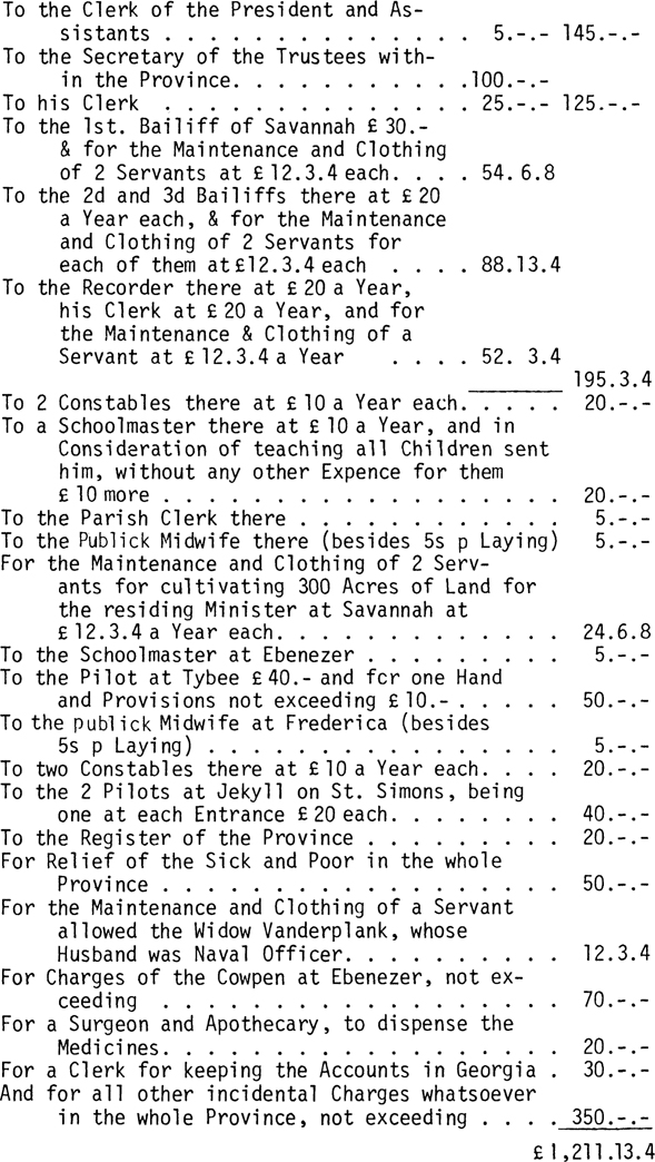 And towards the Supply thereof, the Trustees have by this Ship sent you in their Sola Bills £ 500, being 500d of £ 1. each & number’d 10,001 to 10,500. And they have also paid Mrs. [Frances] Watts and her Son as a Remittance to you £ 40.1.9, for you to change your Self with in Account with the Trust out of the Purchase Money of their Lot sold to Mr. [James] Habersham received or receivable by you for their Use; Whereby you will have a full Supply to carry on the said Estimated Expences to Michaelmas next. And the Trustees will take Care to remit timely Supplies for the Remainder to Lady Day next, before which time they will know what further Assistance can be obtained from Parliament; And of which you shall have due Notice.