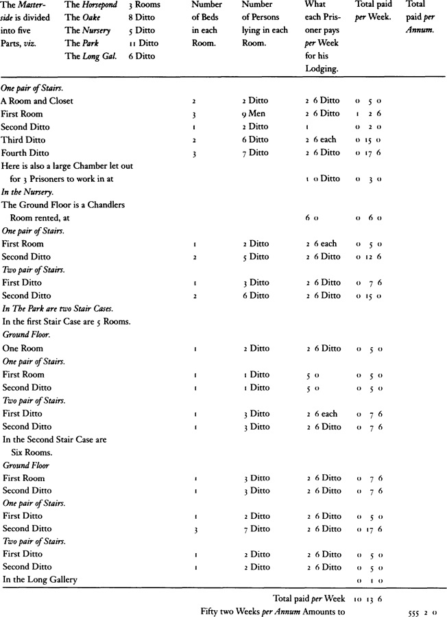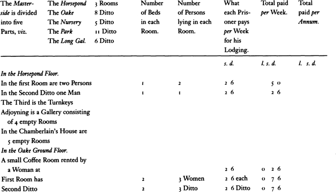Upon Inspection of the several Parts of the said Goal, the Committee find that the said Goal is divided into two Divisions, viz. the Master’s Side, and the Common Side, and that a part thereof is only fenced in with a few weak old Boards; That there are several Rooms on the Master’s Side kept empty, some with but one or two Persons in them, and others at the same time crowded to that degree as even to make them unhealthy; particularly in one of the Rooms in a part of the Prison called the Oake, nine Men are laid in three Beds, and each Man pays 2s. 6d. per Week, so that Room singly produces 1l. 2s. 6d. per Week: But a more particular Account of the Numbers of Prisoners in each Room, and of the Sums they are to pay for Chamber Rent, will appear by the annexed Appendix (B.)