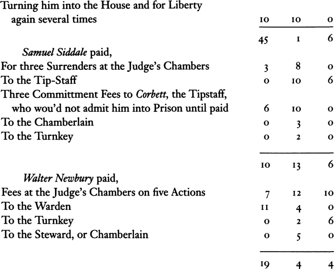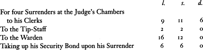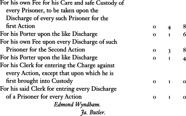 Lieutenant Robert Fitz-Simmonds being discharged by the Plaintiff’s Executors, on the 12th of April 1728, lay then in Prison for his Fees only, about which Time a Gentleman came to the Fleet Prison from an unknown Lady,24 to discharge all such Prisoners as remained there for Fees only, provided the same exceeded not the Sum of three Guineas each, Or that the Warden would discharge such Prisoners of all Fees and Demands for that Sum; Upon which Mr. Thomas Bambridge (then Warden) sent for twelve Prisoners, and gave the said Gentleman a List of their Names, with his full Demands on them severally, which were considerably more than three Guineas each: However, Bambridge, in Compliance with the Lady’s great Charity, and in regard to the poor Prisoners, consented to accept the Three Guineas for each Prisoner, in full Discharge of all Demands; assuring the said Gentleman, That they should be discharged on that Condition; whereupon he paid Bambridge, in the Presence of the said Twelve Prisoners, Thirty Six Guineas for their Discharge: But as soon as the Gentleman’s Back was turned, Bambridge insisted on all his former Demands to the full, and would not suffer them to go out of Prison till they had given him Notes for what exceeded the Three Guineas.