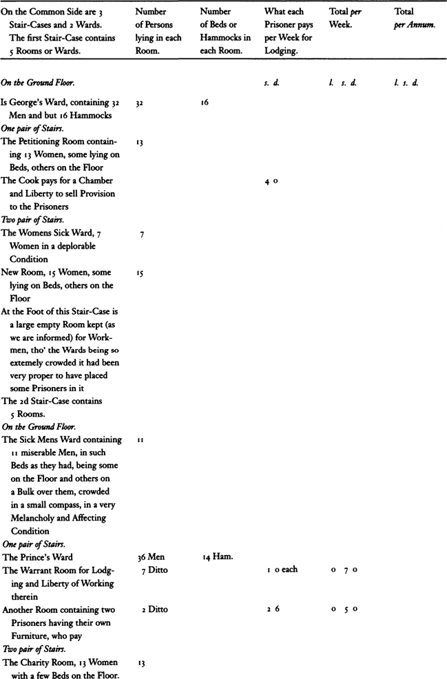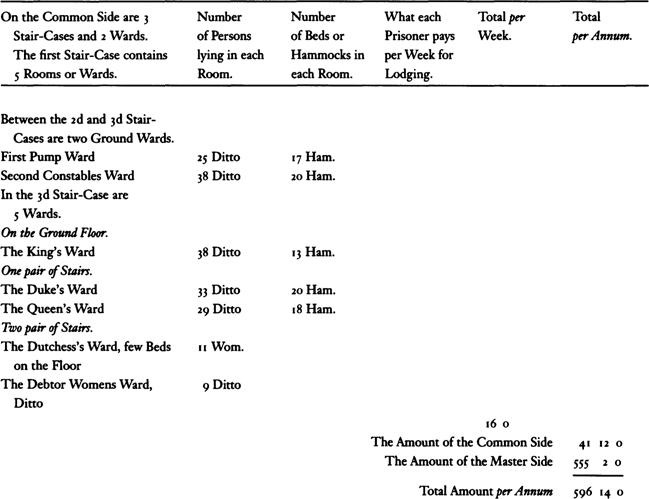 The Common Side is inclosed with a strong Brick Wall, in it are now Confined upwards of 330 Prisoners, most of them in the utmost Necessity; they are divided into particular Rooms called Wards, and the Prisoners belonging to each Ward are lock’d up in their respective Wards every Night, most of which are excessively Crowded, Thirty, Forty nay Fifty Persons having been locked up in some of them not Sixteen Foot Square; and at the same time that these Rooms have been so crowded, to the great endangering the Healths of the Prisoners, the largest Room in the Common Side hath been kept empty, and the Room over George’s Ward was let out to a Taylor to work in, and no Body allowed to lye in it, tho’ all the last Year there were sometimes Forty, and never less than Thirty Two Persons locked up in George’s Ward every Night, which is a Room of Sixteen by Fourteen Feet, and about Eight Feet high; the Surface of the Room is not sufficient to contain that Number, when laid down, so that one half are hung up in Hammocks, whilst the other lie on the Floor under them; the Air is so wasted by the Number of Persons, who breathe in that narrow Compass, that it is not sufficient to keep them from stifling, several having in the Heat of Summer perished for want of Air. Every Night at Eight of the Clock in the Winter, and Nine in the Summer, the Prisoners are locked up in their respective Wards, and from those Hours until Eight of the Clock in the Morning in the Winter, and Five in the Summer, they cannot upon any Occasion come out, so that they are forced to ease Nature within the Room, the Stench of which is noisome beyond Expression, and it seems surprising that it hath not caused a Contagion.