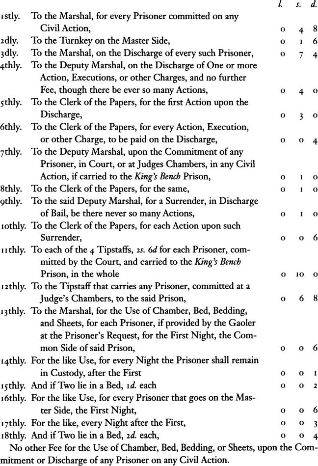 A Table of Fees to be taken by the Marshal of the King’s Bench Prison, in the County of Surry, for any Prisoner or Prisoners committed, or coming into Goal, or Chambers Rent there, or Discharge from thence on any Civil Action.