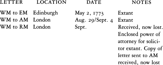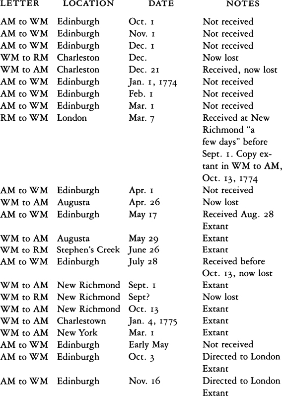 The letters listed are those that are known to have been written between William Mylne (WM) and his mother Elizabeth Mylne (EM), his sister Anne (AM), and his brother Robert (RM) between May 1773 and November 1775. Many were not received and lost due to the uncertainties of mail carriage, and there were undoubtedly additional letters of which we have no specific evidence. Some that we know to have been received have since been lost. Most of the letters to William seem to have been directed to Charleston, all those to Anne and Robert to Edinburgh and London, respectively. “Location” below refers to the place where a letter was written or from where it was dispatched. The normal time of carriage for transatlantic mail was from two to three months. (The letters after November 1775 that are quoted in Chapter 5 do not represent a consistent correspondence and are excluded from this calendar. They are scattered fairly randomly through the family correspondence deposited at the Scottish Record Office.)